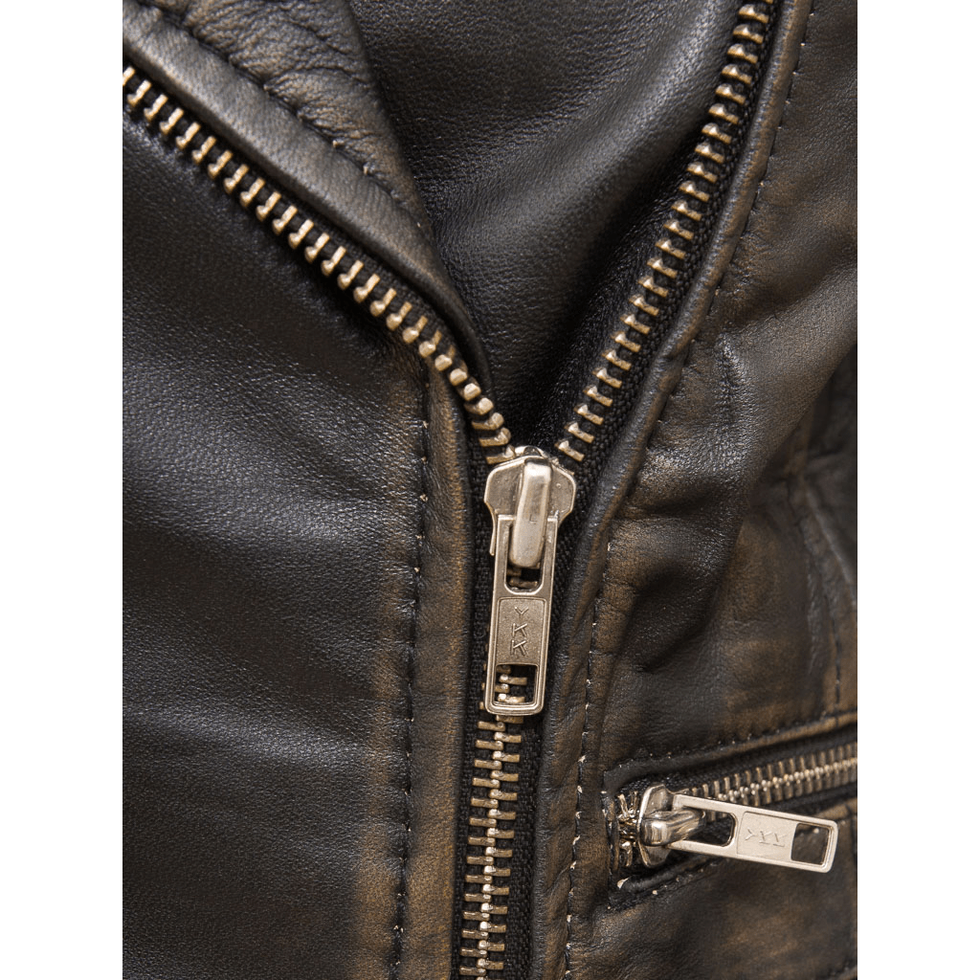 A stunning, vintage rendition of the classic, asymmetric leather biker jacket. This version in a soft sheep nappa leather features an off centre YKK zip over a double breasted front with wide, notched lapels and press studs to hold them in place.